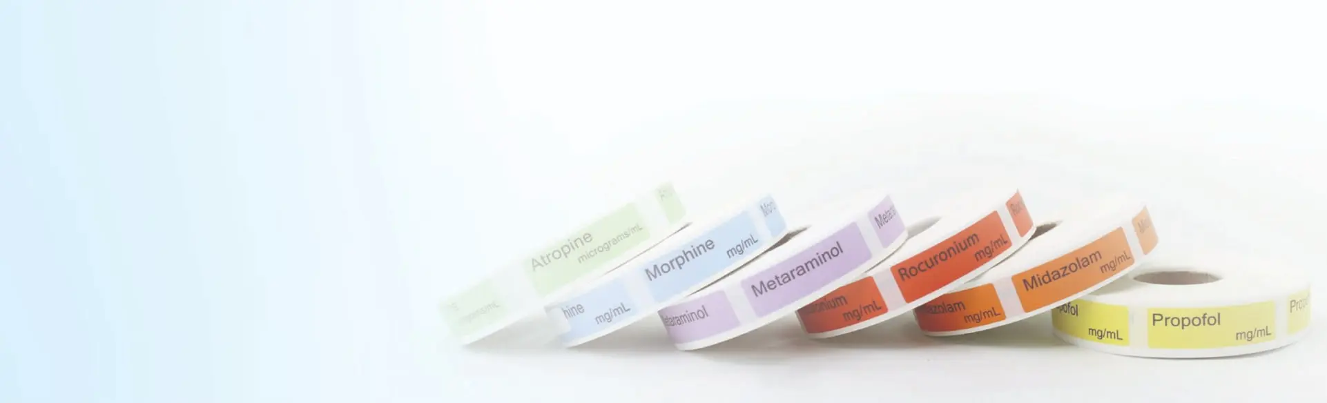 Clear, colour-coded syringe labels designed to support safe anaesthetic practice and accurate medication identification in theatres and procedural areas.