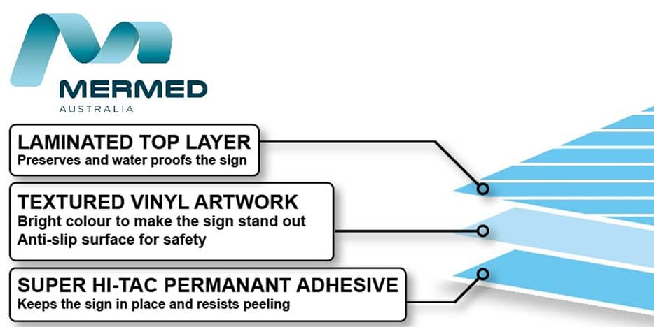 Alan Mercieca, Mermed Managing Director, was very particular about sourcing a product that performed better in the market and overcame traditional floor signage issues. He sourced floor signage with super hi-tac adhesive to ensure the floor sign stays in place and resists peeling. The artwork is printed on a textured vinyl in bright colour. This makes the sign noticeable with an anti-slip surface. The vinyl is then finished with a high quality, laminate that further protects and waterproofs the sign